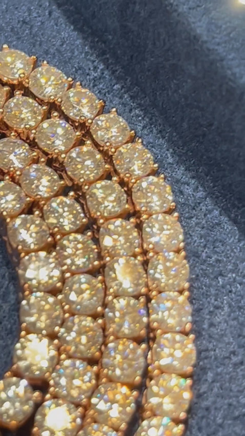 P R L Drip exclusive 4MM Moissanite Tennis Bracelet . Made of 925 sterling silver and PVD plated with a thick layer of Gold. Each link on this moissanite tennis necklace measures exactly 4 millimeters in diameter.
